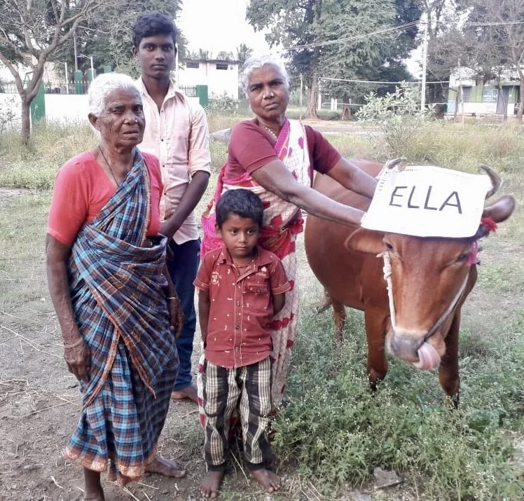 Her life changed when she joined a Nandri Mothers group and received a loan to buy a cow. A generous lady called Ella, donated the money to Nandri to buy a cow for Mrs Maari and in honour of this donation, Mrs Maari named the cow ‘Ella’. Each day she takes the cow with her when she works in the fields. She sells the milk to earn extra money to feed her family who also benefit from the dairy produce made from Ella’s milk.
